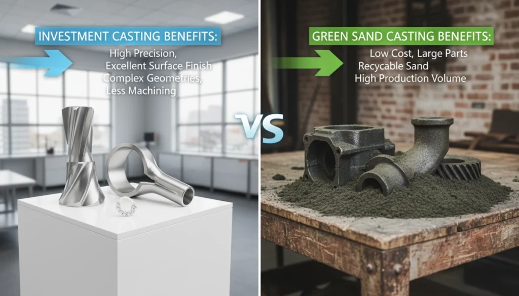 Discover the advantage of investment casting over green sand casting for precision parts surface finish cost and design flexibility